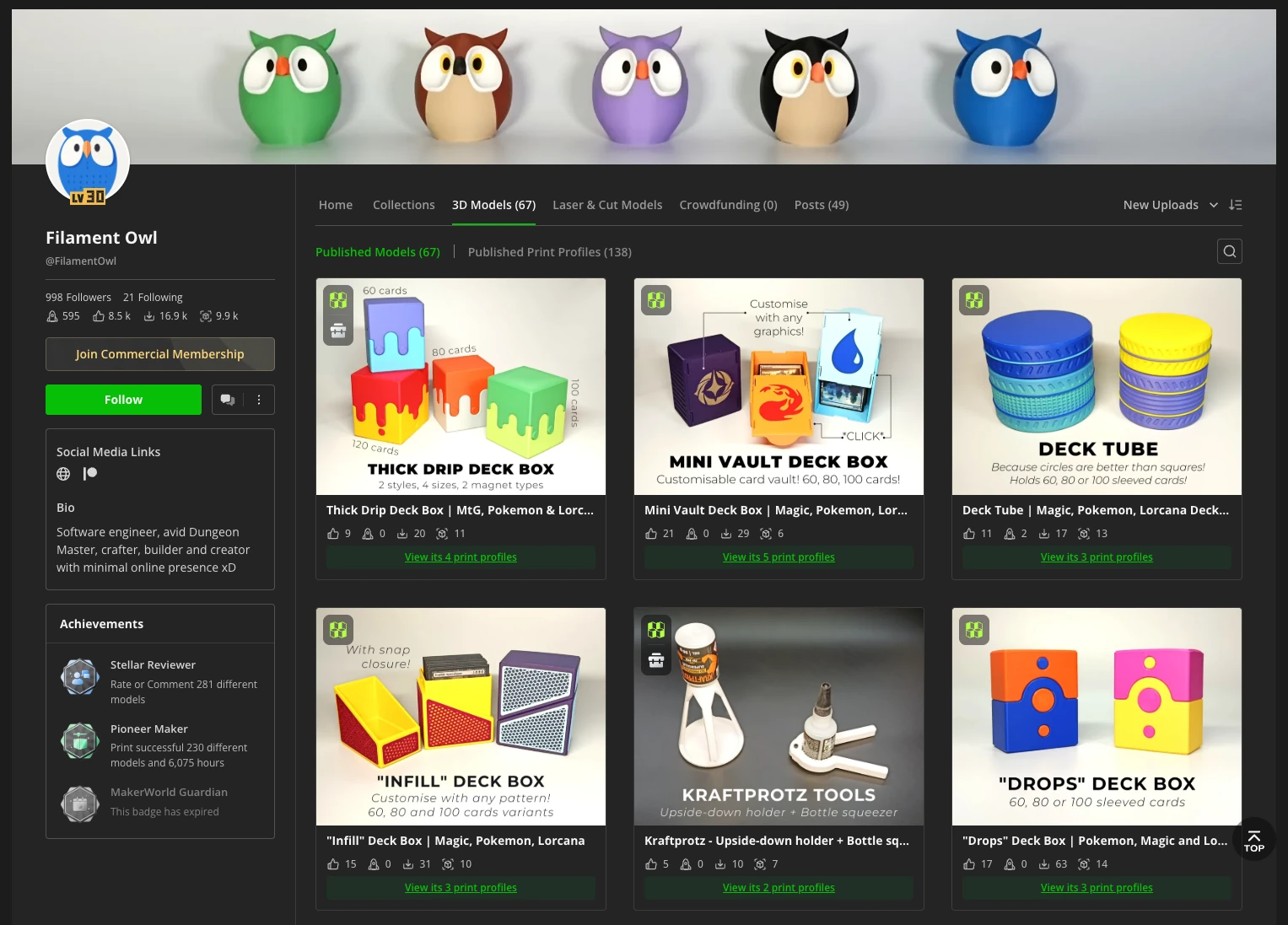 With the help of my wife, I attended more shows, started a small independent side business called Filament Owl, created my own brand, and of course bought more filament, more materials, more equipment, more printers. Right now, my garage is a full-fldged 3D printing workshop. Needless to say, I spend more than I earn, but I see this business as means to fuel my passion. Making money is not my goal. Funding the hobby is my goal, at least most of it!