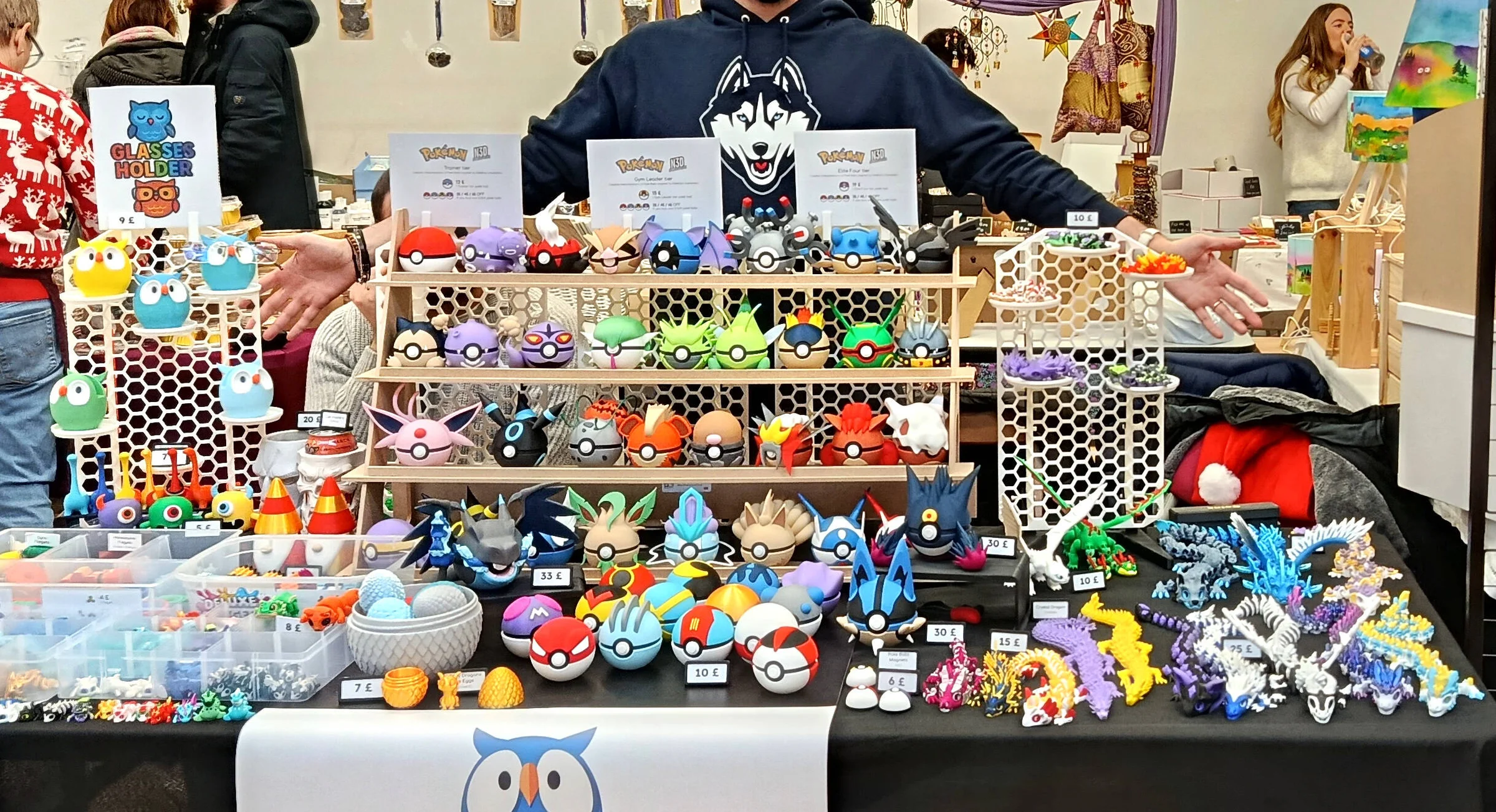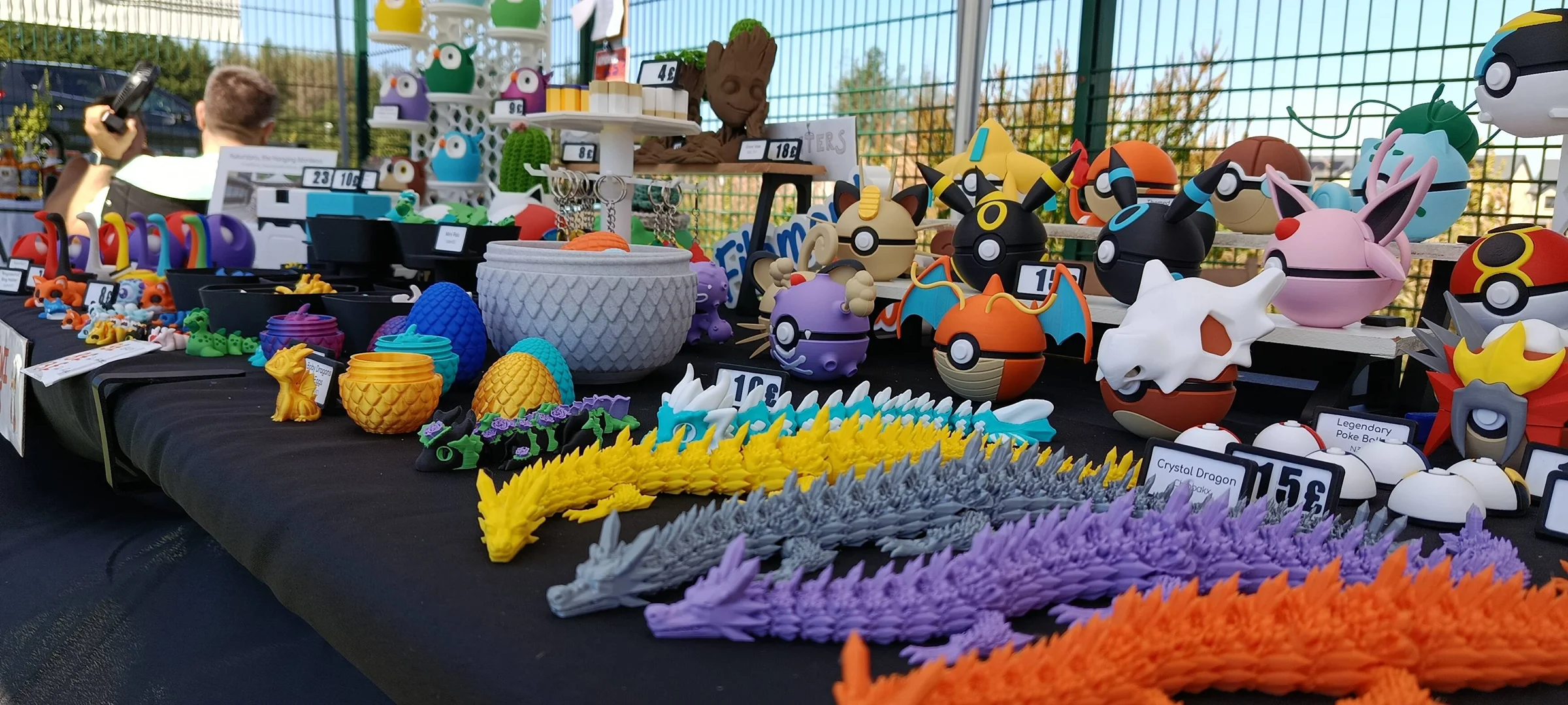 Shortly after, I started printing all sorts of things. I started learning CAD, and bought a Shapr3D license to keep designing my own models. I printed stuff for the house: brackets, socket covers, containers, organisers. Then I started printing fun objects: flexi animals, articulated dragons, fidgets, and the amazing N3D poke balls. The next year I started attending craft shows, selling my abundant stock of vibrant and colorful items. I adored them. And above everything, I enjoyed seeing the expression of pure wonder on people’s faces when they discover how such objects come into reality.
